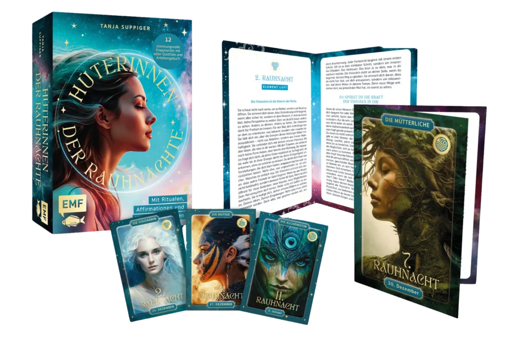Die „Hüterinnen der Rauhnächte“ verkörpern passend zu jeder Rauhnacht eine archetypische Energie, die den Fokus auf Persönlichkeitsanteilewie Selbstbewusstsein, Kreativität oder Kommunikation lenken.