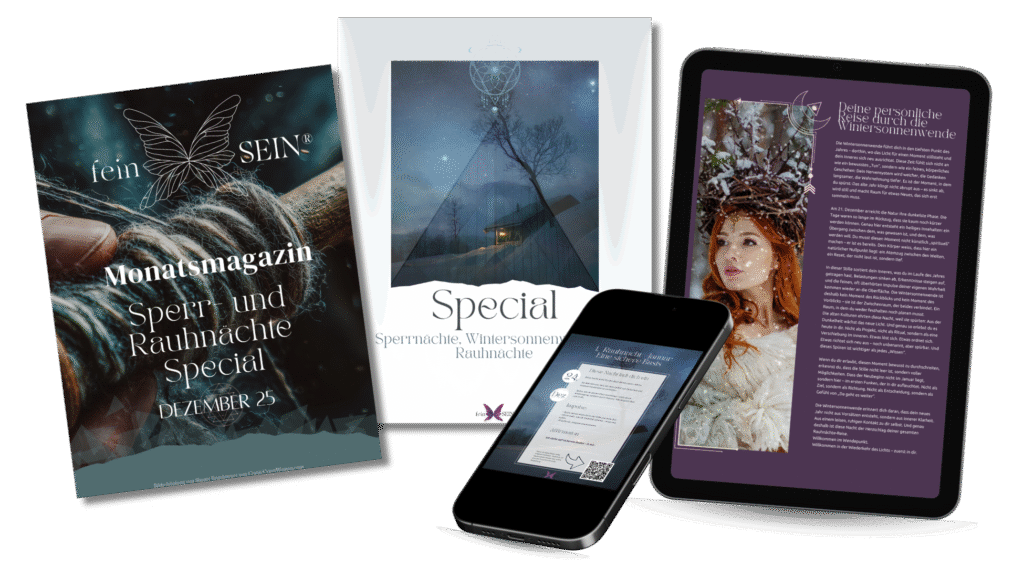 Damit du diese besondere Zeit bewusst gestalten kannst, haben wir eine Sonderausgabe des feinSEIN® Magazins geschaffen – liebevoll, ruhig, klar, atmosphärisch und voll von Impulsen, die dich durch jede einzelne Sperr- und Rauhnacht begleiten.